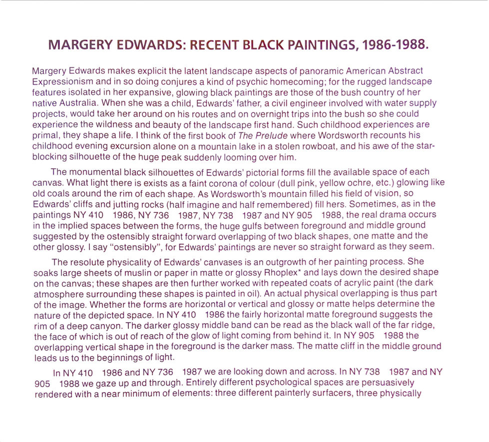 This is the catalogue for Margery's 1988 exhibition "Recent Black Paintings and Works on Paper" at Holdsworth Contemporary Galleries in Sydney. It includes an essay by Stephen Westfall.
